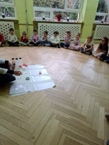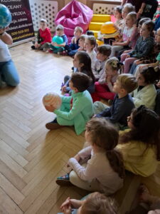 W czwartek 27.11.2025r. nasze przedszkolaki oglądały przedstawienie Teatrzyku DUR – MOLL: pt. „Wesoły pociąg pełen instrumentów”. Zabawa z muzyką była wspaniała, dzieci poznały różne instrumenty i ich brzmienie. A w finale przedstawienia zagrała orkiestra złożona z przedszkolaków pod batutą wesołego dyrygenta