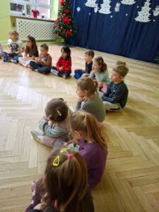 W poniedziałek 01.12.2025r. – Teatrzyk pt. „Niespodzianka od serca”, finansowany z programu miejskiego „Kulturalny przedszkolak”. Przedstawienie poruszyło serca zarówno dzieci, jak i nauczycieli. Jego bohaterami jest rodzeństwo, które chce sprawić sobie wzajemnie radość. To piękna opowieść o tym, że prezenty nie muszą być drogie ani materialne, by były wartościowe. Dzieci dowiedziały się, że najważniejsze są emocje, którymi się dzielimy i gesty, które płyną z miłości.