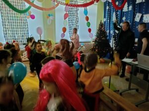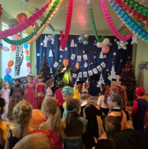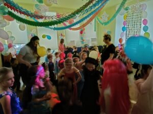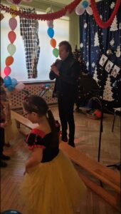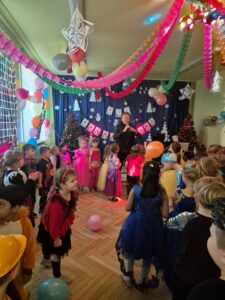 Wspaniałą zabawę dla dzieci poprowadził dziadek Alinki – pan Andrzej z zespołu Partita, który z ogromnym zaangażowaniem i energią zachęcał wszystkich do tańca i wspólnych zabaw. Dzięki niemu bal był pełen radości, śmiechu i niezapomnianych chwil.