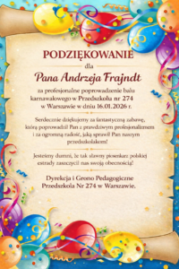 W naszym przedszkolu w piątek 16 stycznia odbył się wspaniały bal karnawałowy, który na długo pozostanie w pamięci dzieci. Kolorowe stroje, radosna muzyka i uśmiechy na twarzach sprawiły, że atmosfera była wyjątkowa i pełna magii.