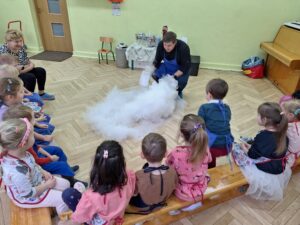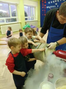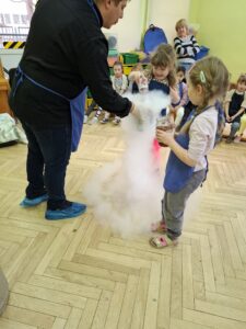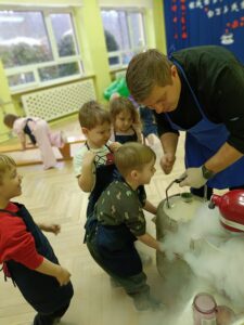 W zeszły piątek 06.02.br. nasze przedszkolaki wzięły udział Warsztatach kulinarnych „Kuchnia molekularna” . Były to kreatywne zajęcia łączące naukę z zabawą, podczas których dzieci poznały bezpieczne eksperymenty z ciekłym azotem i suchym lodem. Dzieci tworzyły jadalne cuda, np. , dymiące chrupki czy najszybsze lody na świecie.